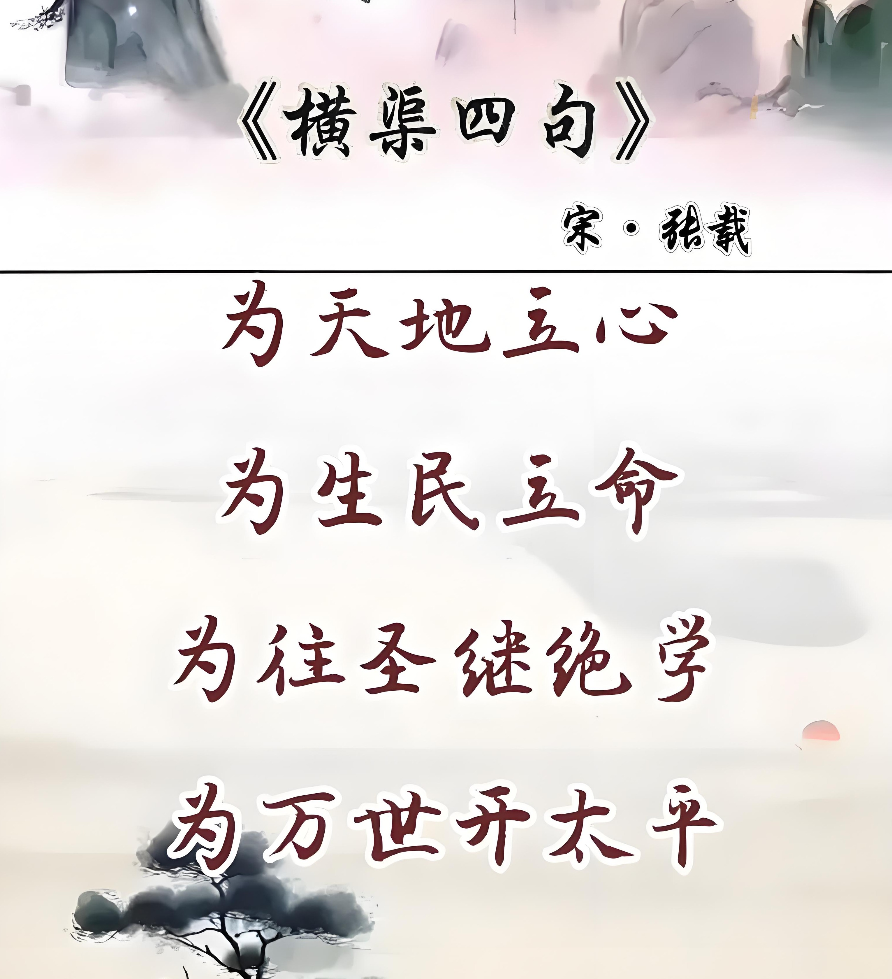 横渠四句出自北宋思想家、教育家、理学家张载所著《横渠语录》,即“为天地立心,为生民立命,为往圣继绝学,为万世开太平” ,著名哲学家冯友兰将其称作“横渠四句” ,其言简意宏,传诵不绝,成为历代中国知识分子的理想追求。